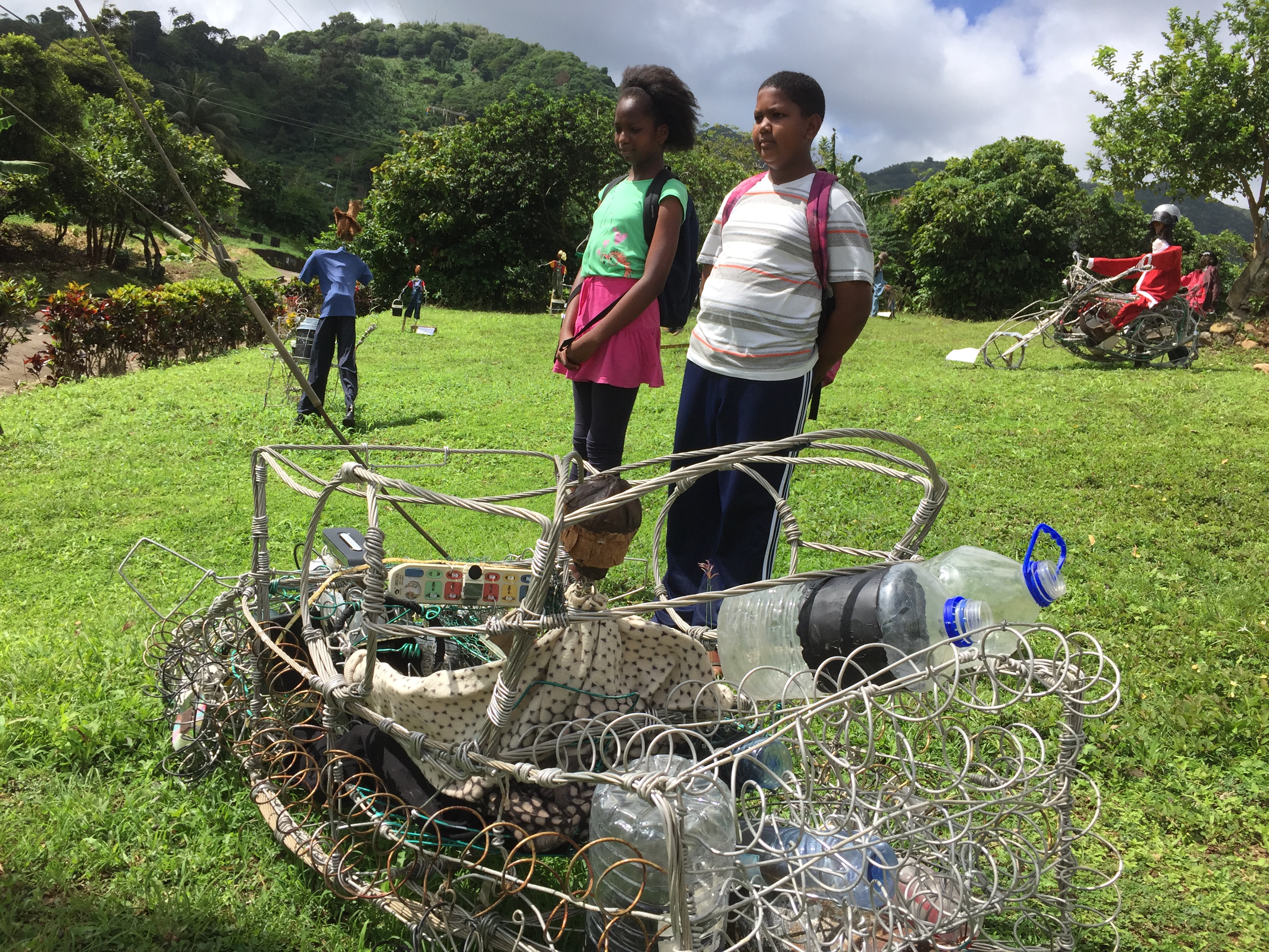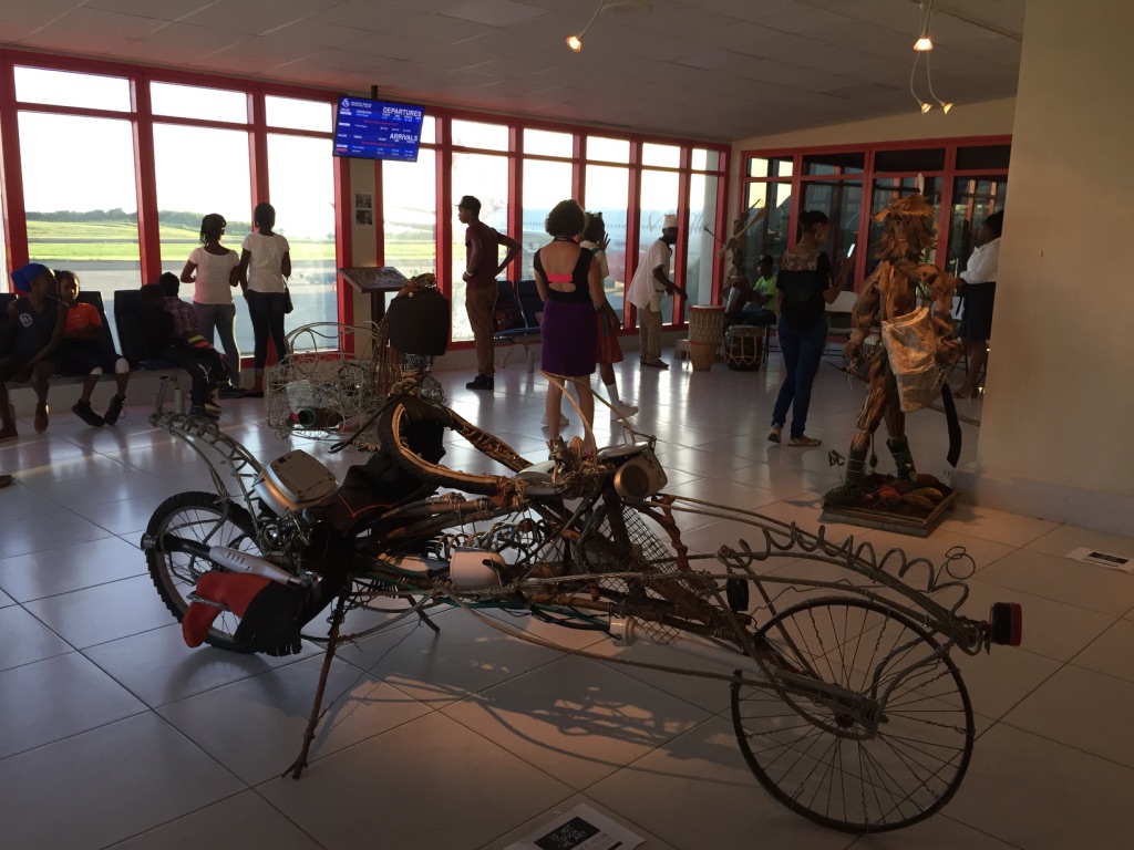 On Friday, November 17th at the Waving Art Gallery at the Maurice Bishop International Airport, here in Grenada, we saw a very special opening reception for Godfrey Luke’s solo exhibit. Visitors were welcomed by figures and vehicles made from found materials around Luke’s community in Upper St. John, St. Andrew’s. The figures, made of armatures of cables were padded with natural elements like coconut fibre, banana fibre, and coconuts. The vehicles, a motorcycle, car and helicopter were more reliant on recycling material that would otherwise have been discarded. Luke’s paintings round out the exhibit giving both a sense of a physical and conceptual environment.