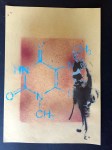 The background element is the chemical make up of theobromine, one of the key elements to cocoa. I also used a gold spray paint as a way of associating value with this magical chocolate formula. Overall I want to portray the cocoa farmers as a kind of alchemist. Knowledge from oral tradition is passed down and the cocoa is grown and harvested and ultimately processed into chocolate. In this way the farmers are extracting gold (chocolate) from the soil.